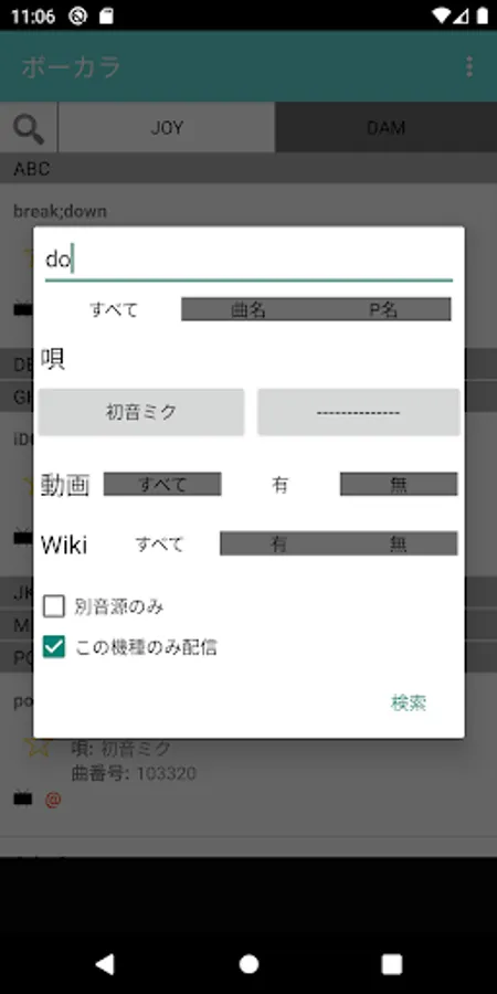 You can search by song name, song name (kana), P name, type of vocaloid, presence of video / wiki, presence of other model distribution.
