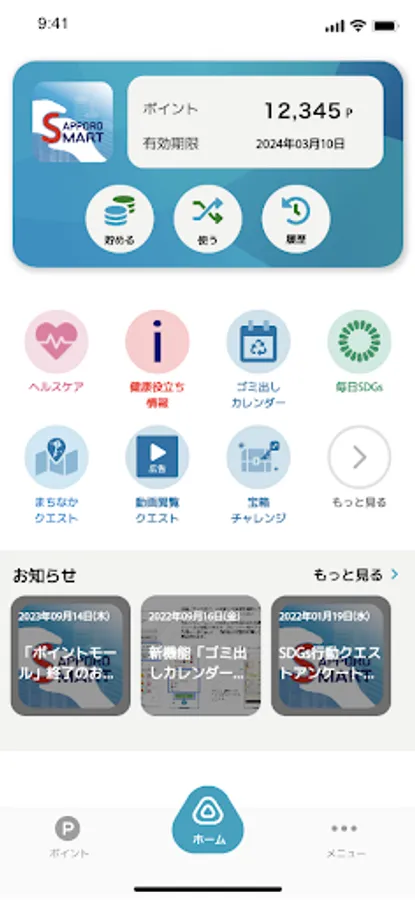 With the Sapporo Area Smart App, you can earn and use points using the app. It is also equipped with features unique to the app, such as a notification function that allows you to receive information from the government.