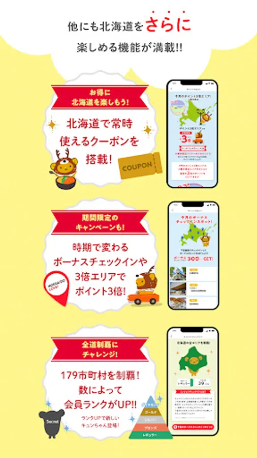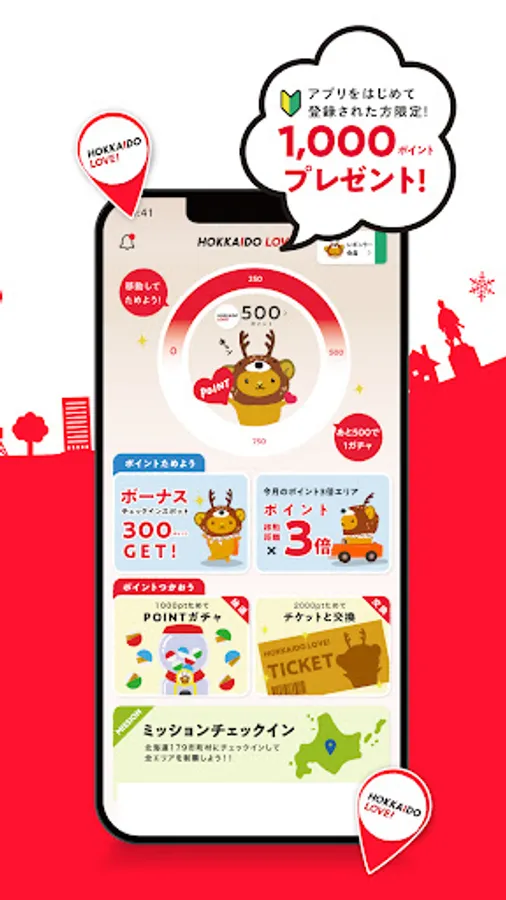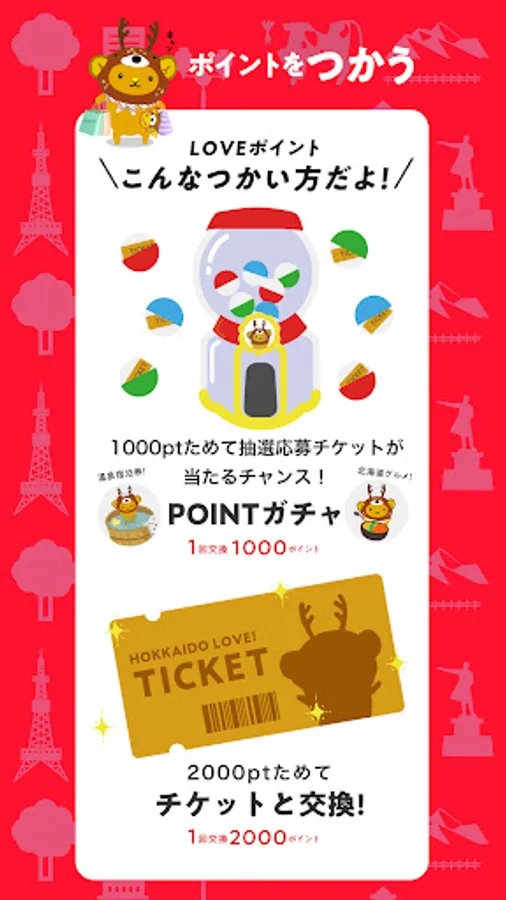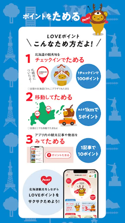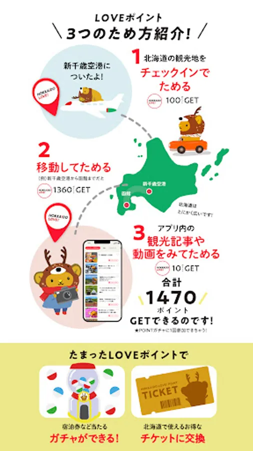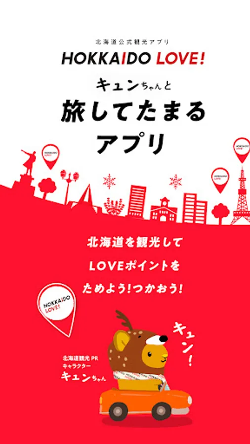 It is an application that allows you to enjoy sightseeing in Hokkaido by saving LOVE points. Enjoy your trip with Kyun-chan!