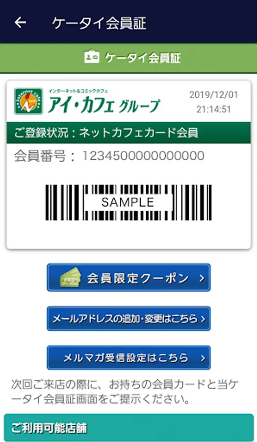 また、ご入店時に会員証として使える「ケータイ会員証」を表示することができます。
