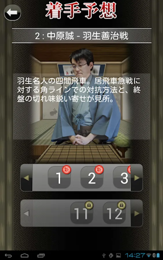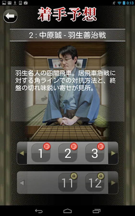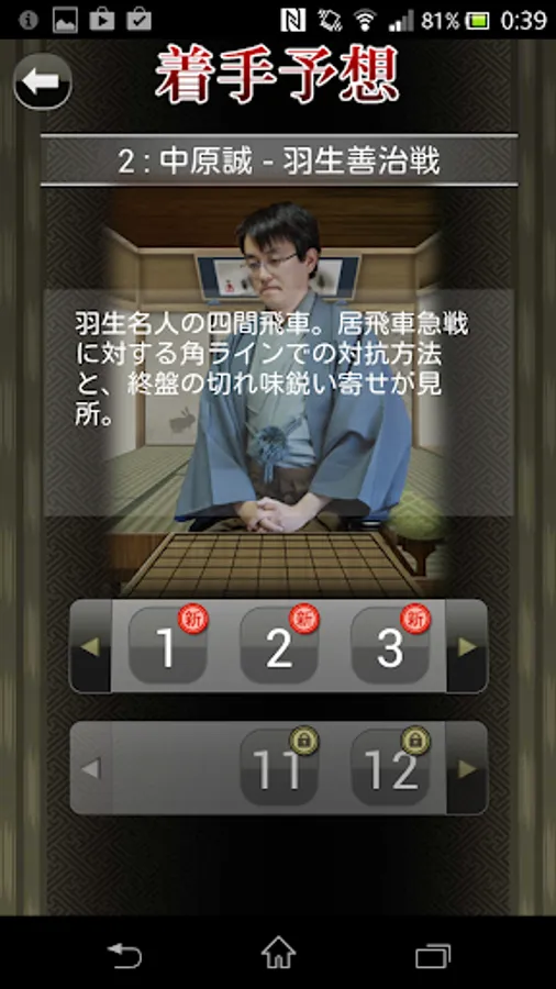 このモードは羽生先生の実戦棋譜を1局全部当てるゲームですが、まずは解説がわからなくても良いですし、不正解でも気にせず、羽生先生の駒組みを学ぶつもりで進めてください。