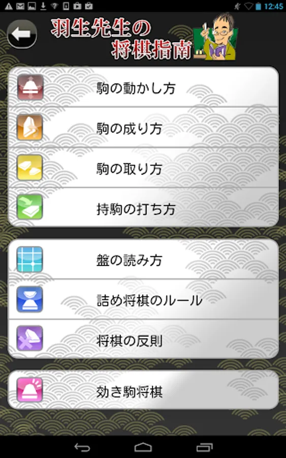 「入門」モードは駒の動かし方から反則まで勉強でき、完全に初めての方でも安心です。お子様の入門者にとっても、子供はゲームは大好きですから、楽しみながらルールを学ぶことができます。