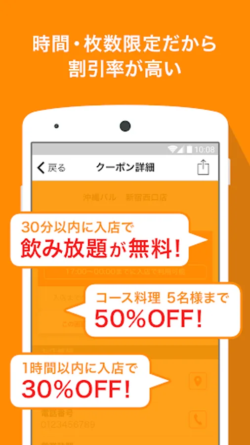 ※ 各店舗の判断で当日の時限クーポンが発行されますので、店舗の空席状況や時間帯により割引状況が変わったり、クーポンが少ない場合がございます。