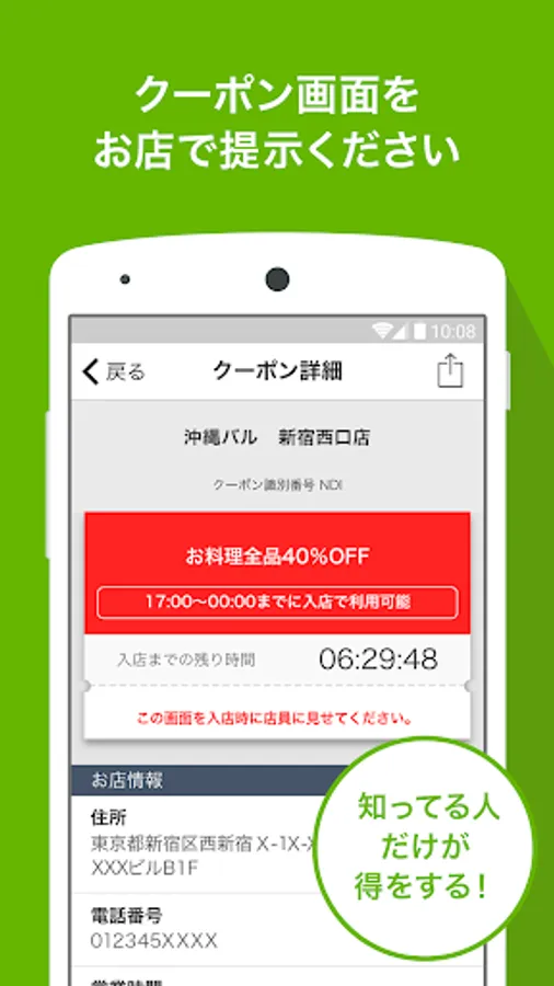 クーポンが発行されている店舗を選択し、割引率や条件を確認後、ダウンロードボタンをタップするとクーポンが取得できます。期限内にスタッフへ提示してください。
