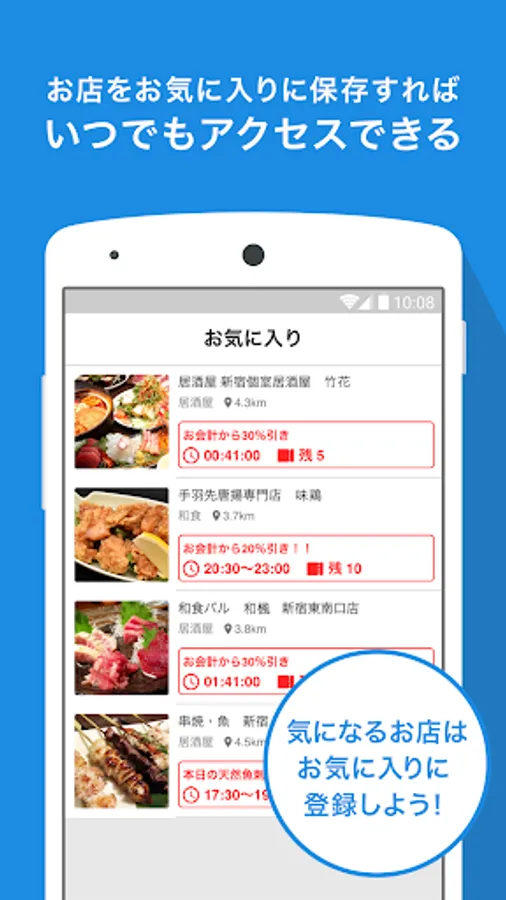 気になる店舗をお気に入りに登録すると、例えば、クーポンが発行されると画面下のメニューバーにお知らせが表示されます。クーポンが発行されたら割引率や時間帯、枚数を確認しダウンロードしてください。