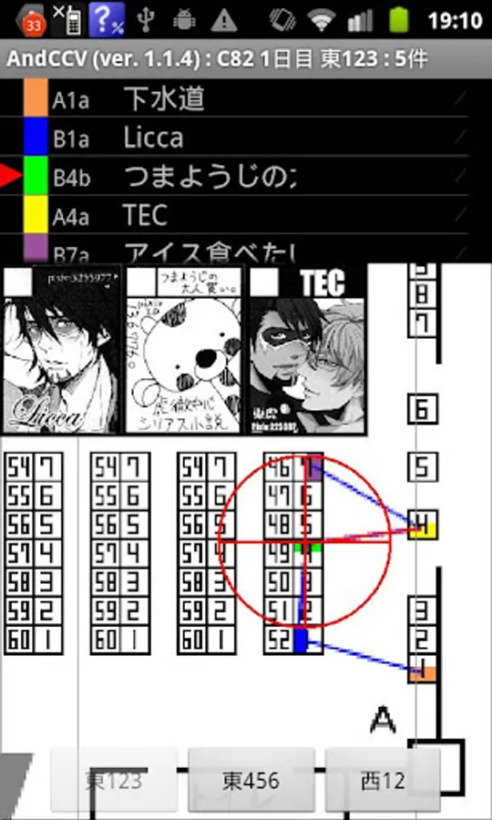 チェックリストモードでサークルが選択されていると、ブロックリストモードボタンが有効になります。ボタンのタッチでブロックリストモードに移行し、選択されていたサークルのブロックのリストを表示します。もちろん従来通り、マップ上のサークルをタッチすることでブロックリストモードに移行することもできます。