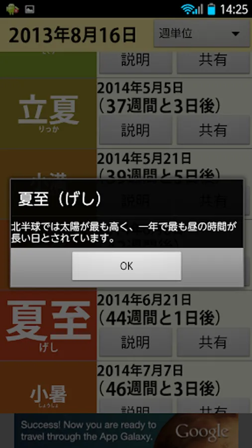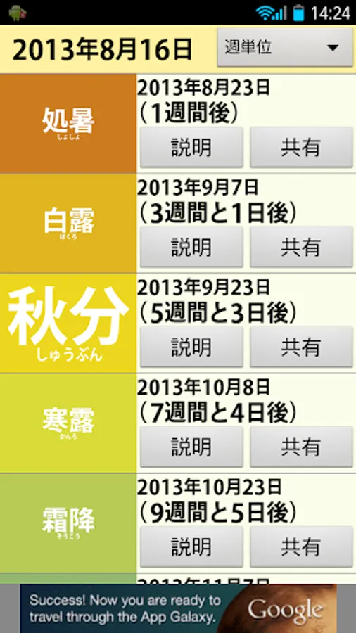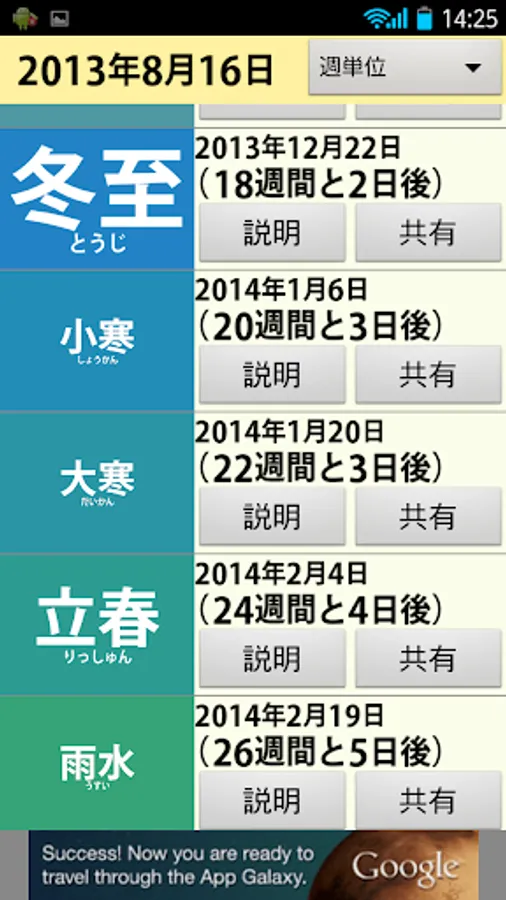 The calculated result can be shared using a variety of apps, such as the Twitter client, in a format such as “The winter solstice after XX weeks.