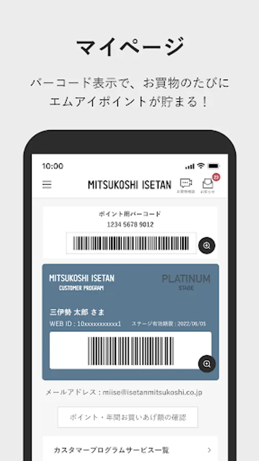 You can check the information and usage history at a glance. If you link with MI CARD, the stage certificate will be displayed and you can participate in the "Isetan Mitsukoshi Customer Program".