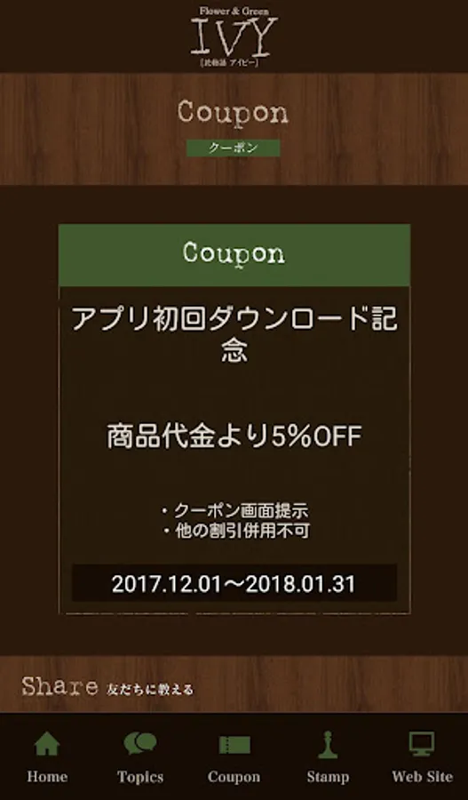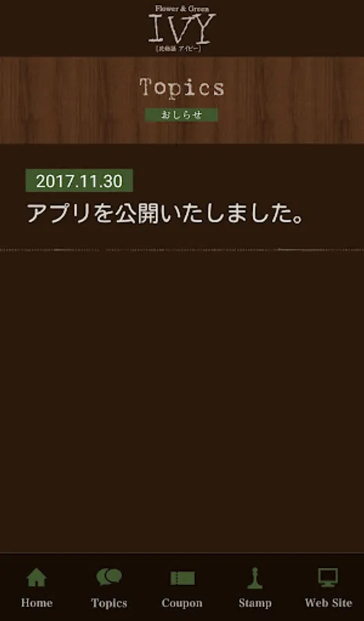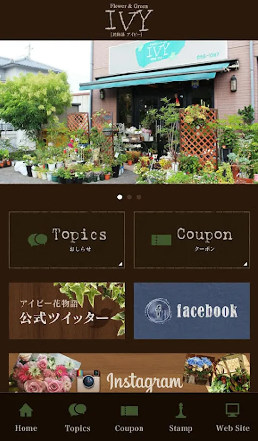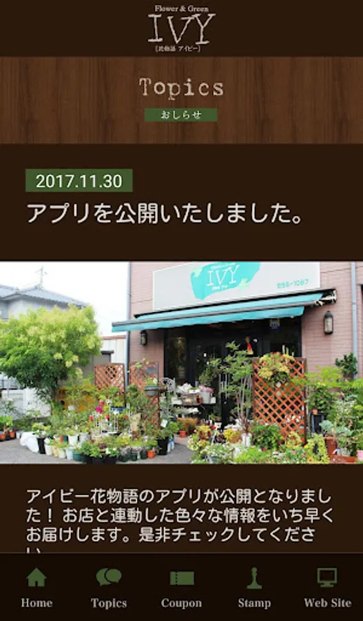 In this application, [IVY flower story - Ivy hanamonogatari -] or to quickly deliver the latest information of, deals coupons for sale, it is also possible to button 1 Tsudeo phone. More convenient to use the app, more familiar [IVY hanamonogatari - Ivy hanamonogatari -] try to use the!