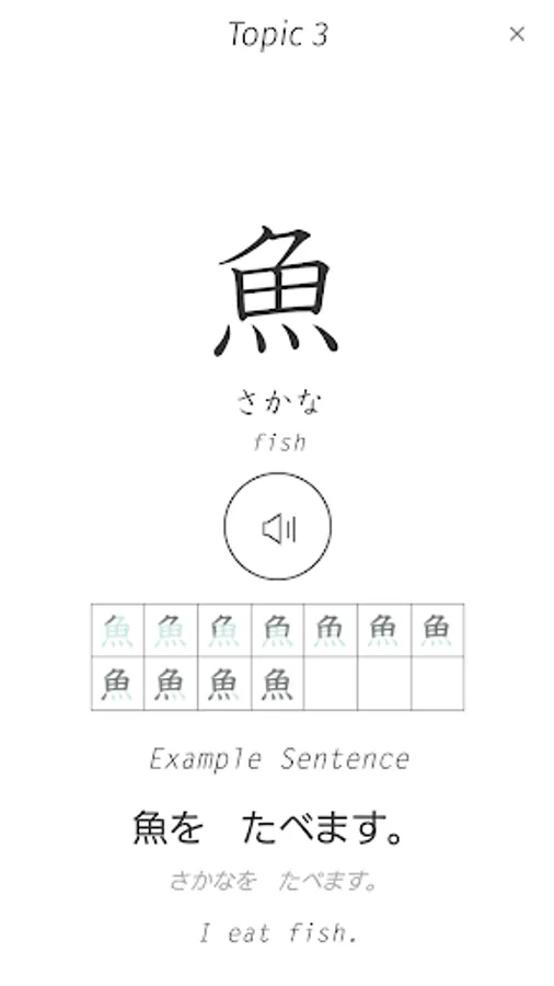 -Features pictures, sound, animation, kanji, stroke order and example sentence to help you remember the kanji.