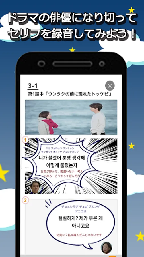 を Incorporates the latest voice recognition and judgment functions to check your pronunciation correctly. Become a drama actor and read the lines.