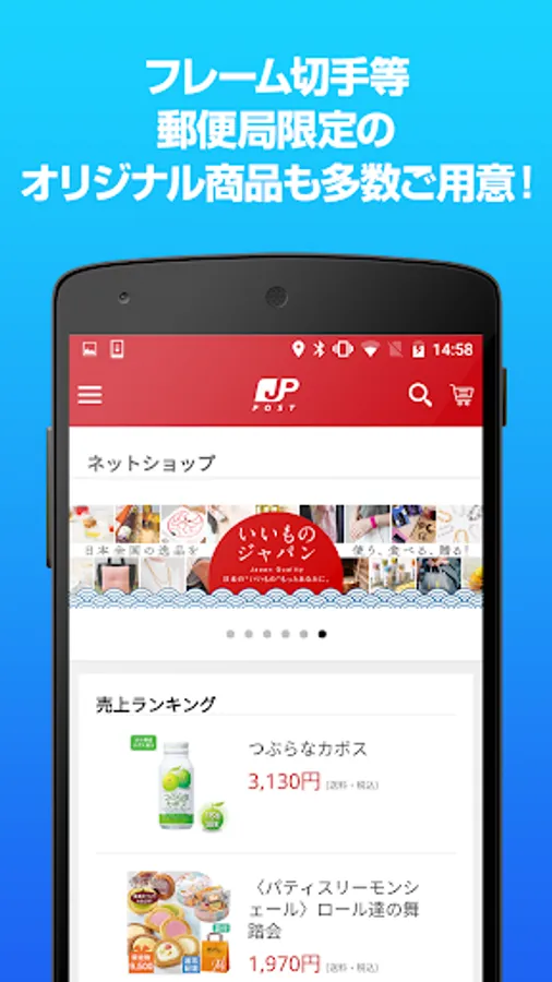 The post office online shop is a mail-order app that allows you to shop for various gifts and special products and daily necessities nationwide. In addition, you can purchase postage stamps such as ordinary stamps, postcards, and letter packs with this application.