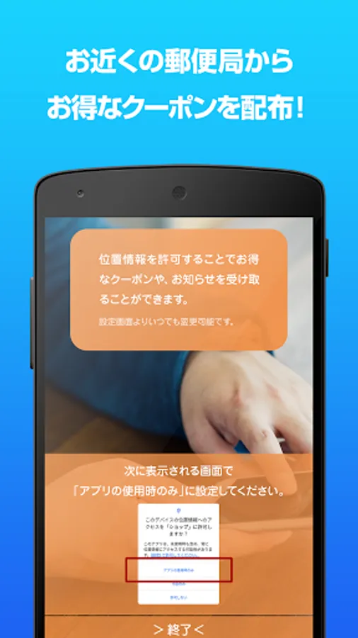 The post office's online shop app collects location information to enable "Push content distribution" and "Search for nearby post offices" by Beacon only if you have permission to acquire location information. , Collects location information even when this app is closed or not in use.