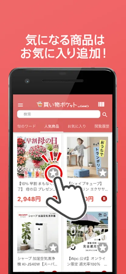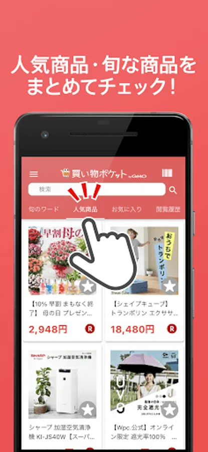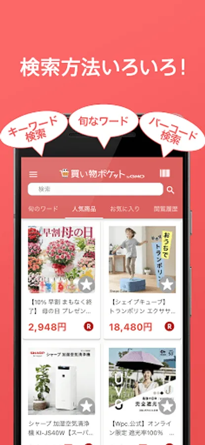 In addition to the product search by text input, just holding the camera in the product bar code and bar code search function that allows you to search for products, from the list of seasonal search keywords, such as only can search the products function choose a keyword to be worried about , you can search for products in a variety of ways.