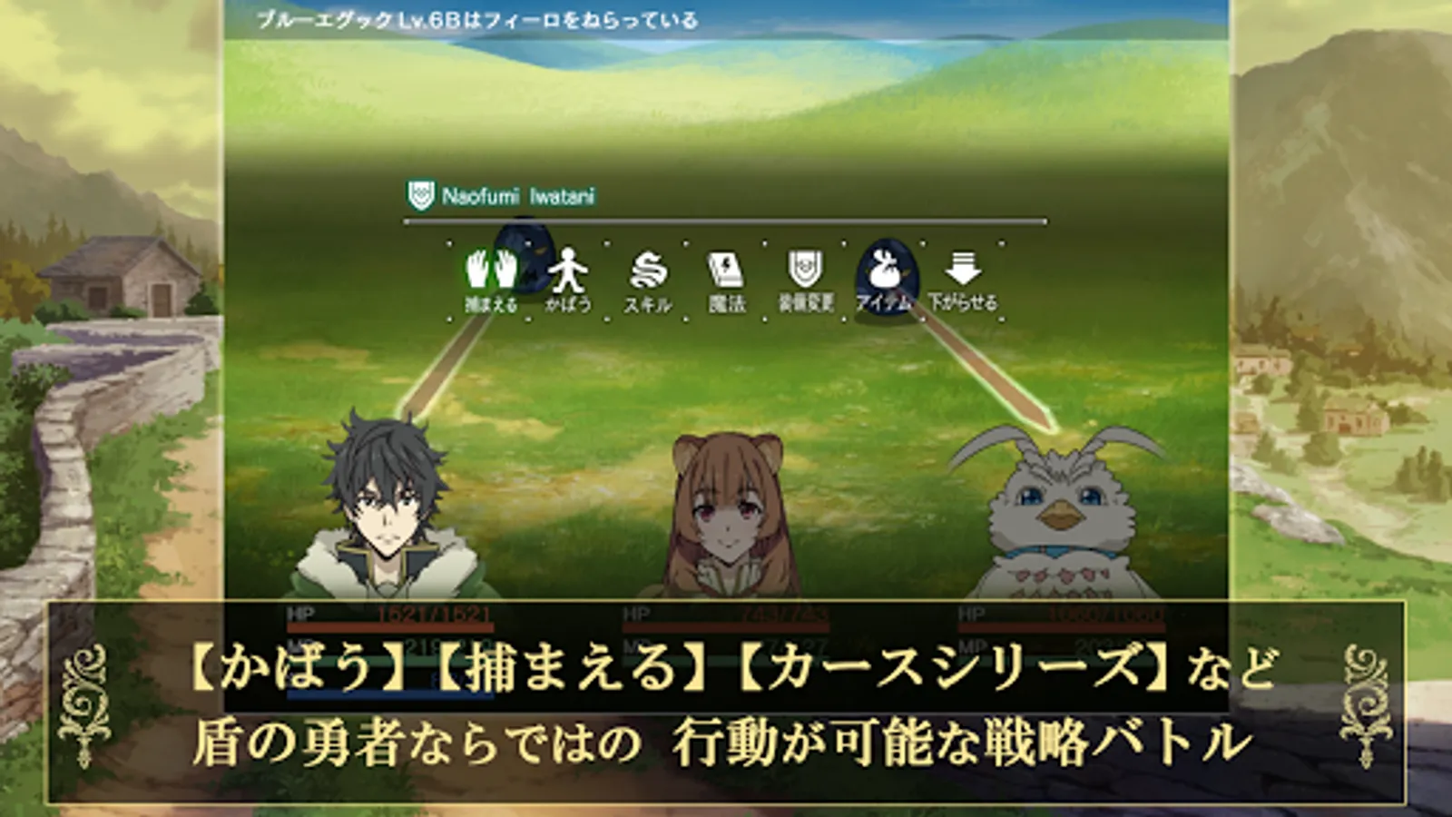 Employs a battle system that takes advantage of the actions of the shield hero, such as "warning" that lets you know the enemy's aim, "capturing" the enemy that aims at you, and "covering" your friends from the enemy.