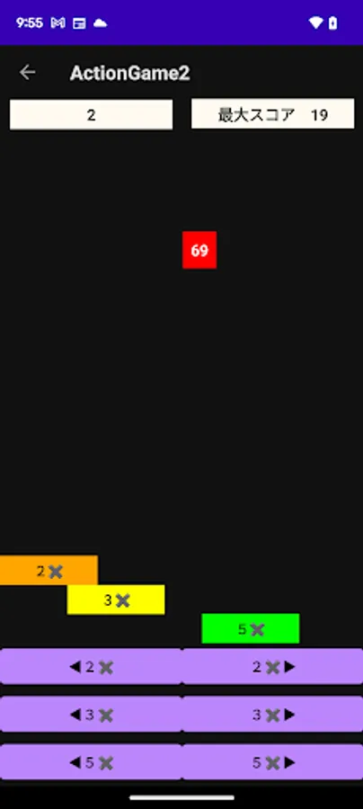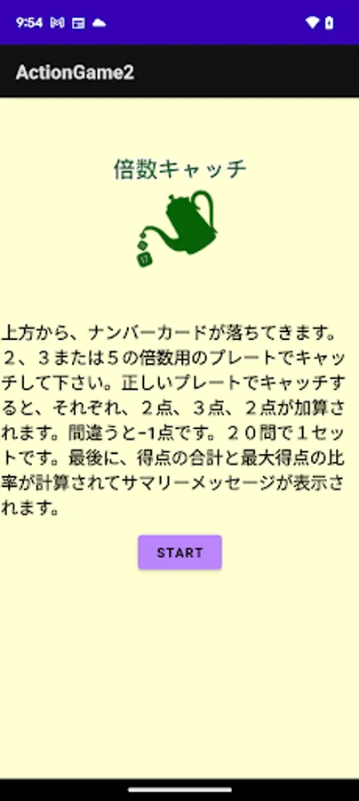 There is a brief description of the game on the cover screen. The screen transitions with the start button and the game starts. A card with a 1 or 2 digit number will fall from above. Catch this with the lower plate. There are three plates for multiples of 2, multiples of 3, and multiples of 5. Plates are moved left and right with their corresponding buttons. +2 points for catching a multiple of 2 or 5, +3 points for catching a multiple of 3, and -1 point for an incorrect catch. At the top left, you'll see your score. To the right of it you'll see the total possible maximum score. The game ends when 20 number cards have fallen. The ratio between your score and your maximum possible score is calculated and a summary message is displayed. Press the back button on the upper left to return to the explanation screen. You can start the game again by tapping Start.