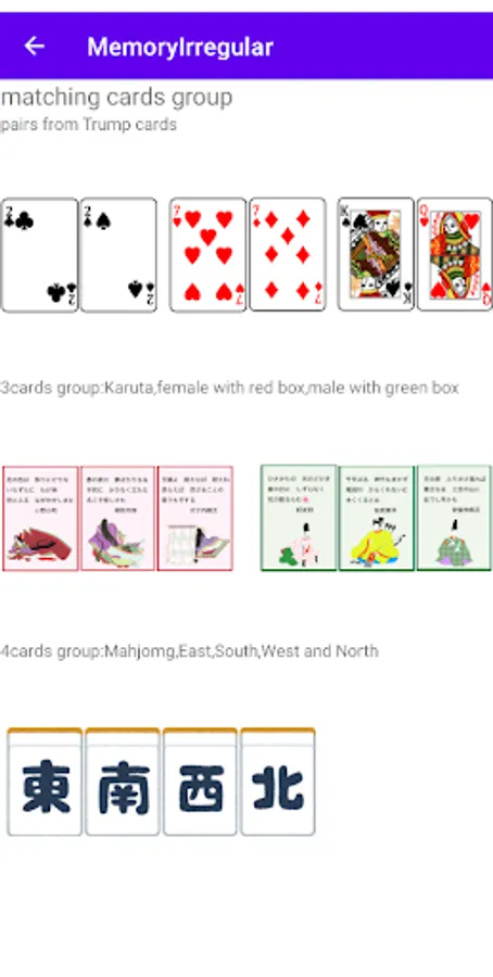 A nervous breakdown that incorporates irregular patterns of 2, 3 or 4 cards required to match. The necessary card combination patterns are presented on the Commet screen, but 2-card sets are used for playing cards, 3-card sets are used for Hyakunin Isshu, and 4-card sets for Mahjong tiles are used. ❤️Queen and ♠️King are correct pair combinations. There are 16 cards face down, so tap to flip them over. When the second card is tapped, if the answer is incorrect, a buzzer will sound and the flipped card will be turned face down. If the answer is correct, the correct answer tone sounds and the card disappears. If you still have a chance of getting the correct answer, you can turn over the third card. Subsequent settings are similar.