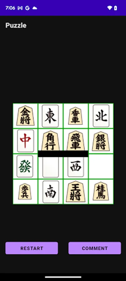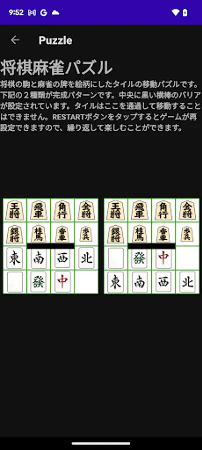 A moving puzzle with shogi pieces and mahjong tiles. Two types of puzzle completion goals are presented on the next cmment screen. If you can bring it to one of them, you're done.