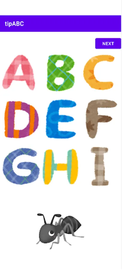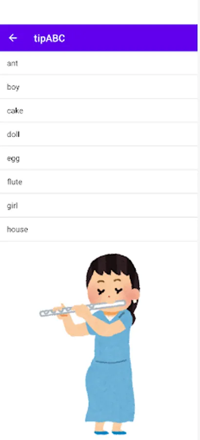 On the first screen, illustrations of nine letters of the alphabet from A to I are displayed. When you tap a letter, an illustration image of an English word starting with that letter is displayed below. Also, only one letter can be heard played by an instrument that starts with that letter. These are the tips.