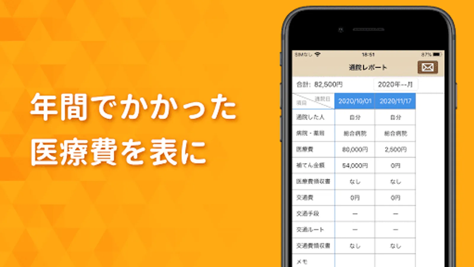 通院記録には、通院日時から治療内容、支払ったお薬代・治療費までまとめて入力できます。