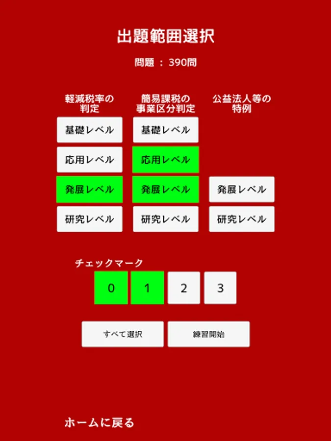 ② "Practice mode" (*) where you can select the difficulty level of the problem and the number of checkmarks and repeatedly solve the problems in the selected range to overcome your weak points.