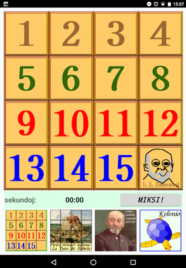 (Rearrange the pieces of 4 × 4 in the correct order is "15 puzzle". Standard is is the number of pieces of 1 to 15, you can switch such as the portrait of Lazarus-Rudobiko-Zamenhof.)