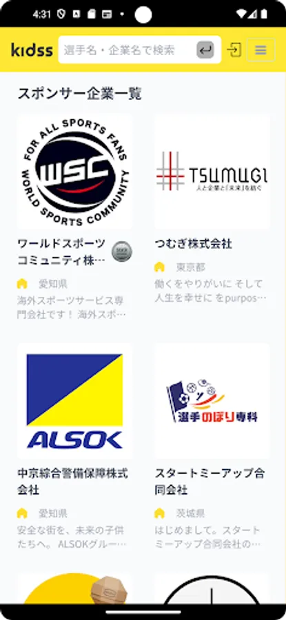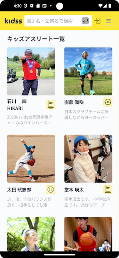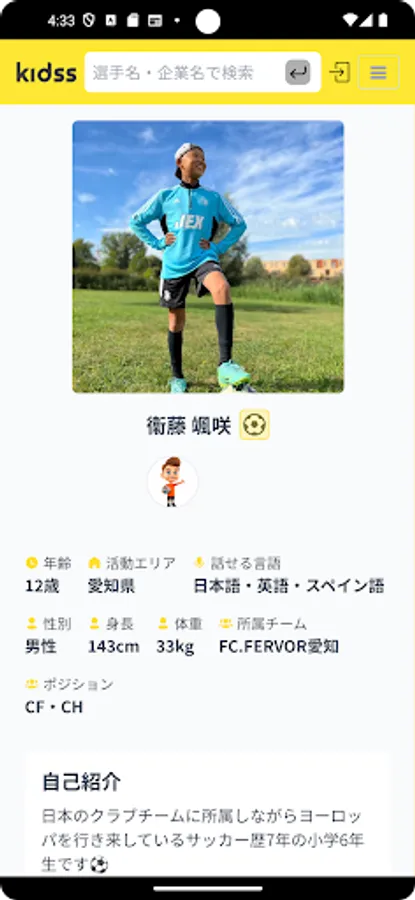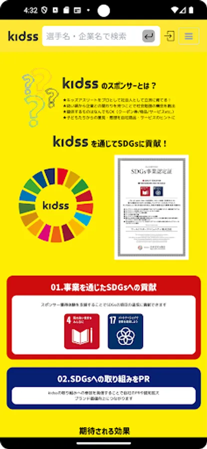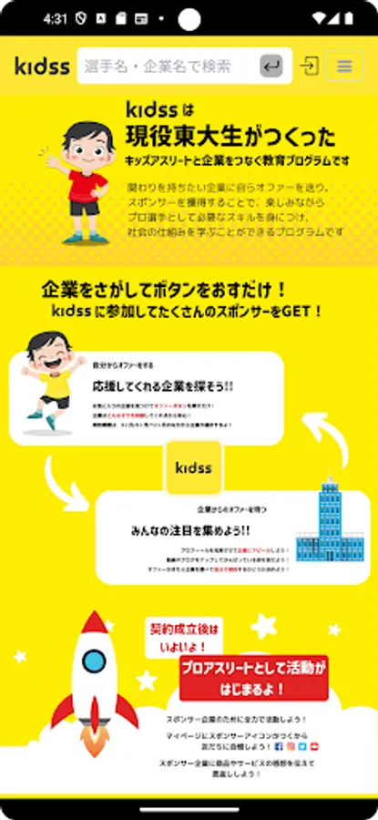 kidss is a service like a real training game where kids athletes play the leading role and learn all the skills and abilities necessary as a professional and as a person through the sponsor acquisition experience and grow themselves. Through this activity, children can have a relationship with companies and society from an early age, and can expand their own growth and activities.