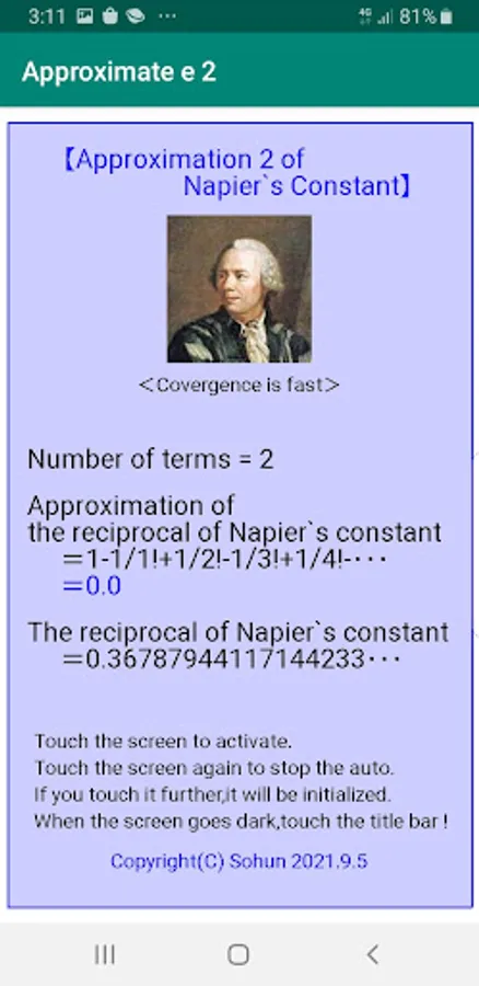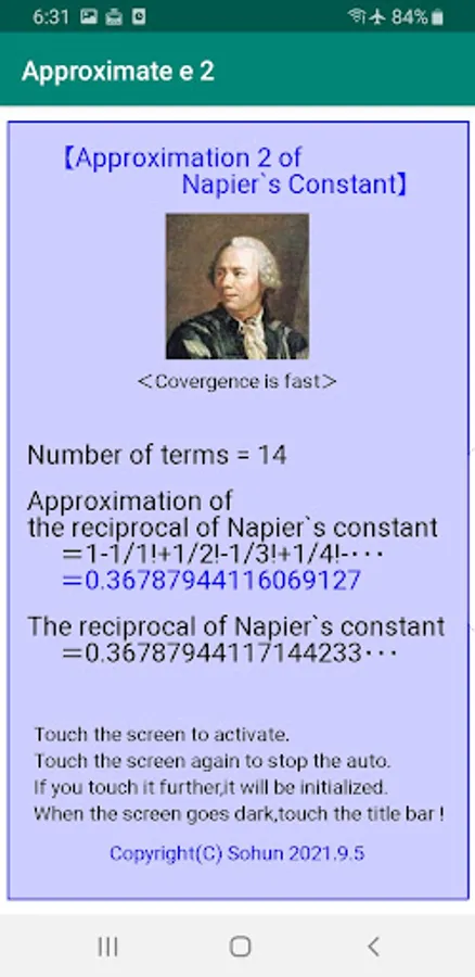 Use the following approximate formula to find an approximation of the reciprocal of Napier's constant e.