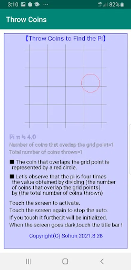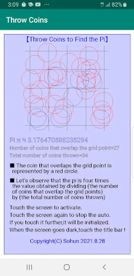 The approximate value of pi can be obtained from the ratio of the number of coins thrown to the number of coins that overlap the grid points (the intersection of vertical and horizontal lines is called a grid point).