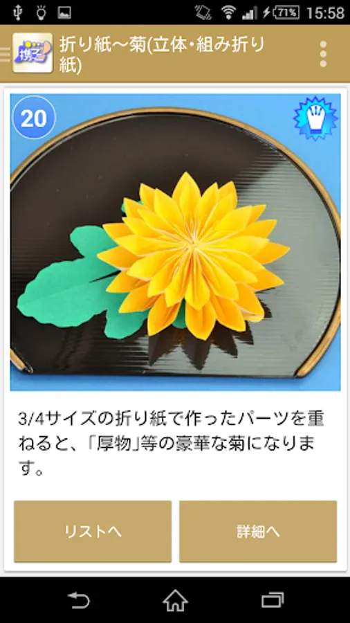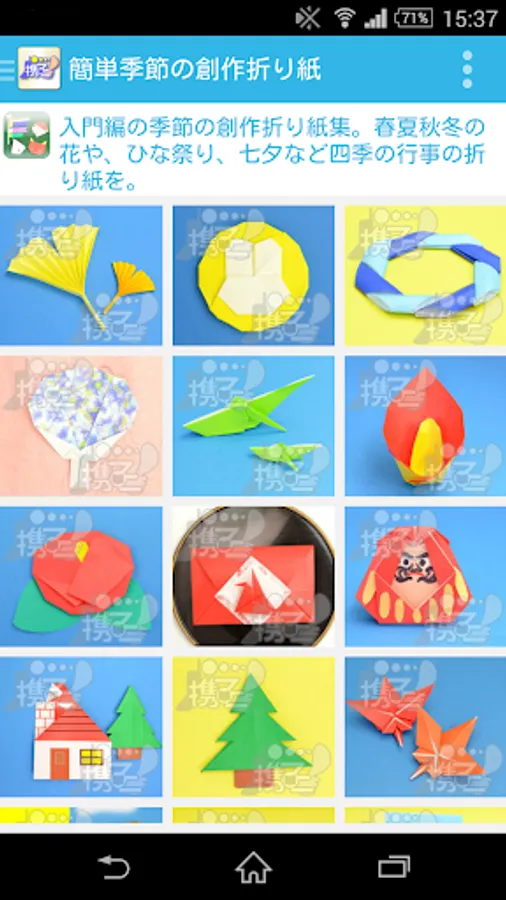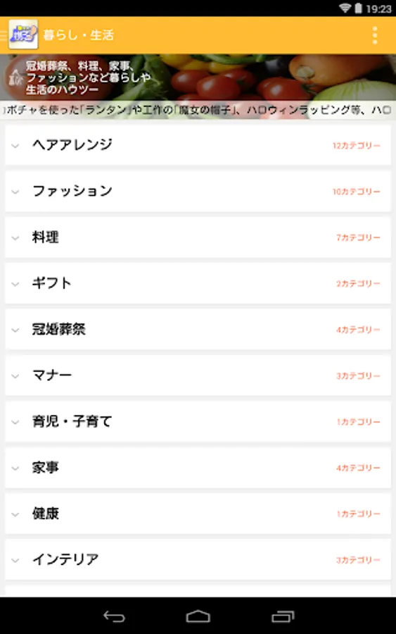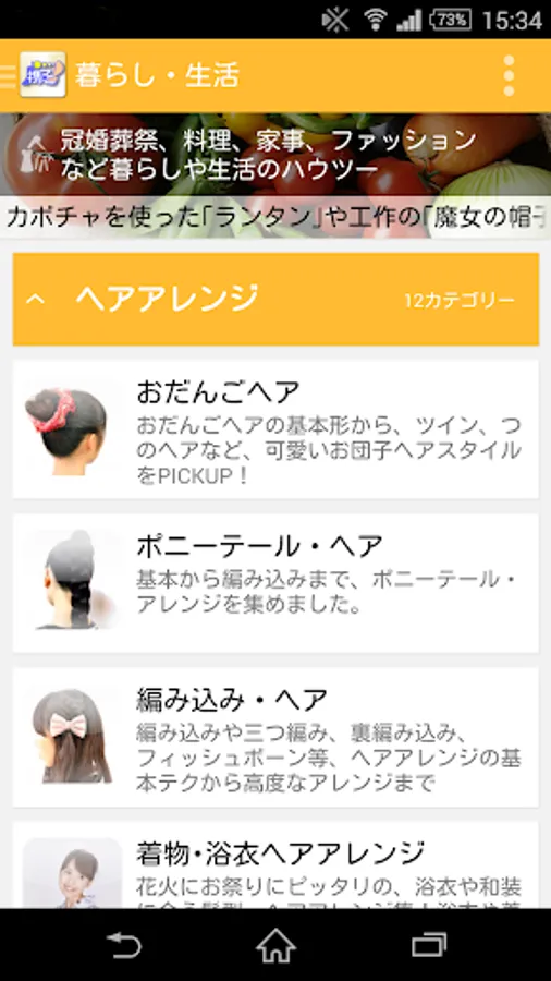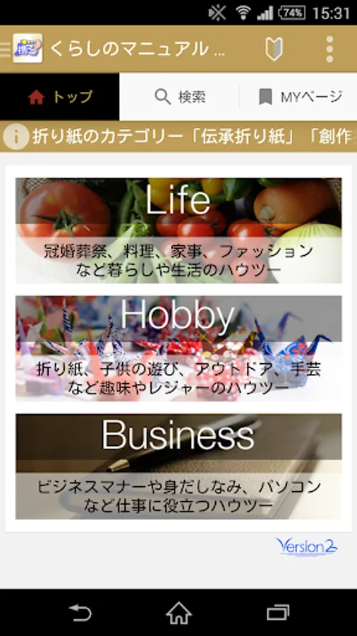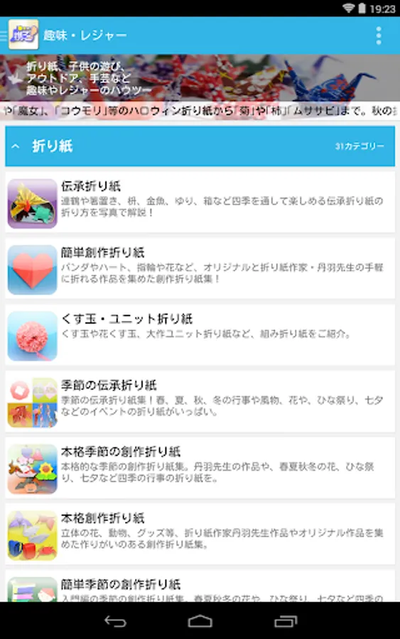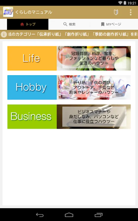 Among them, "Origami" with more than 1,800 folding methods (work) and "Hair Arrangement" with more than 240 styles, "Mufflers", "Scarves/Stoles" and "How to tie a necktie". A certain fashion content, each genre of living how-to that has been strengthened recently is very fulfilling.
