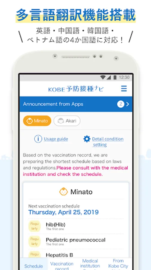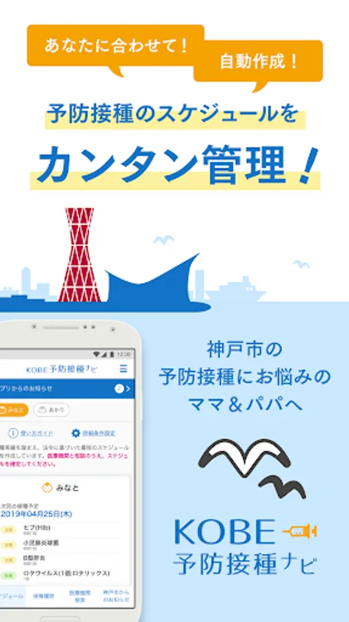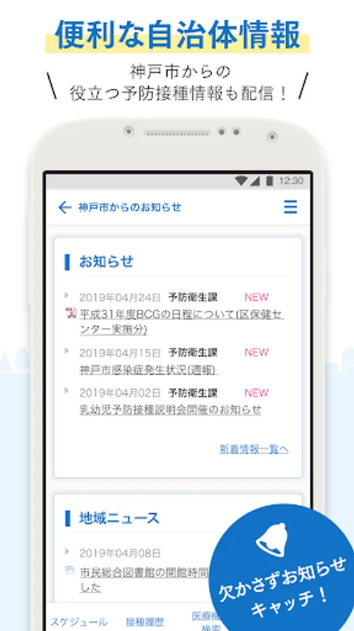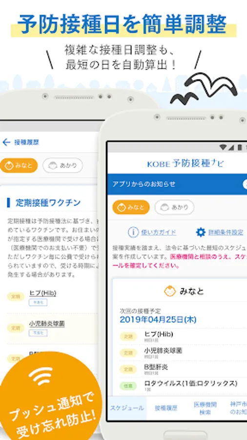 登録した接種予定日が近づくとプッシュ通知でお知らせが届きます。神戸市独自で助成している任意予防接種に関する情報や市からの感染症情報などをお知らせ、確認することも可能です。