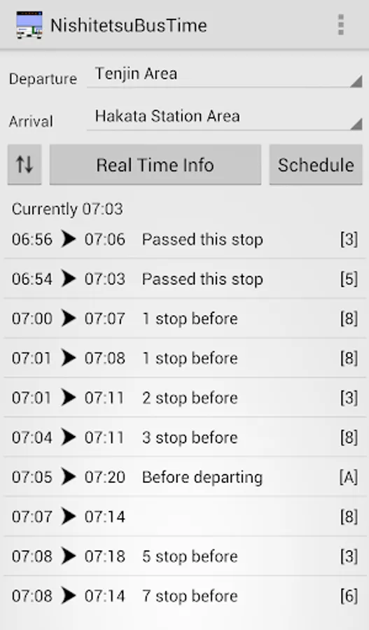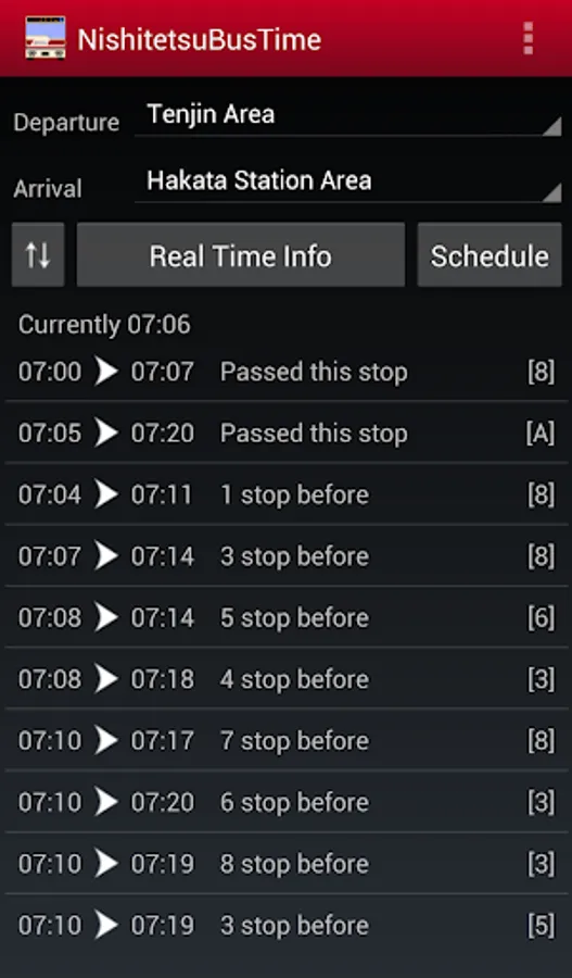 Click "Real Time Info" button, show the timetable. Click the list, the detail information is shown.
