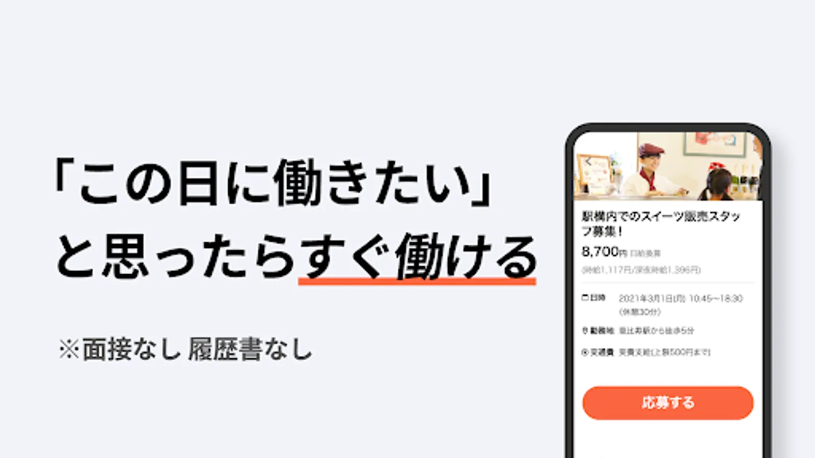 You can easily apply from your smartphone, and there is no pass/fail judgment by interview or resume. You can definitely fill your schedule and start working right away!