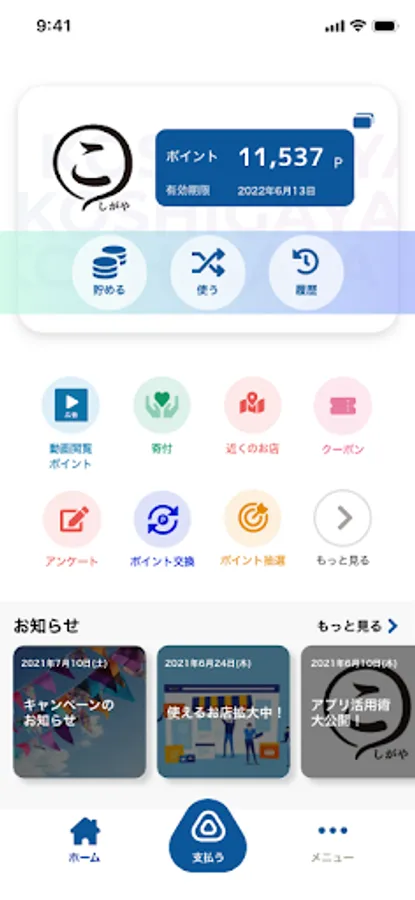 In "Koshigaya Maruko", points can now be earned and used on the app. Not only that, it also has functions unique to the app, such as a coupon function that can be used at member stores and a notification function that allows you to receive valuable information from government and stores.