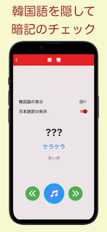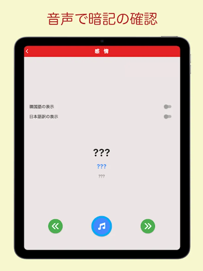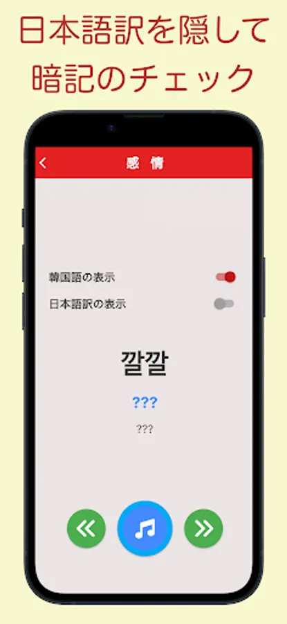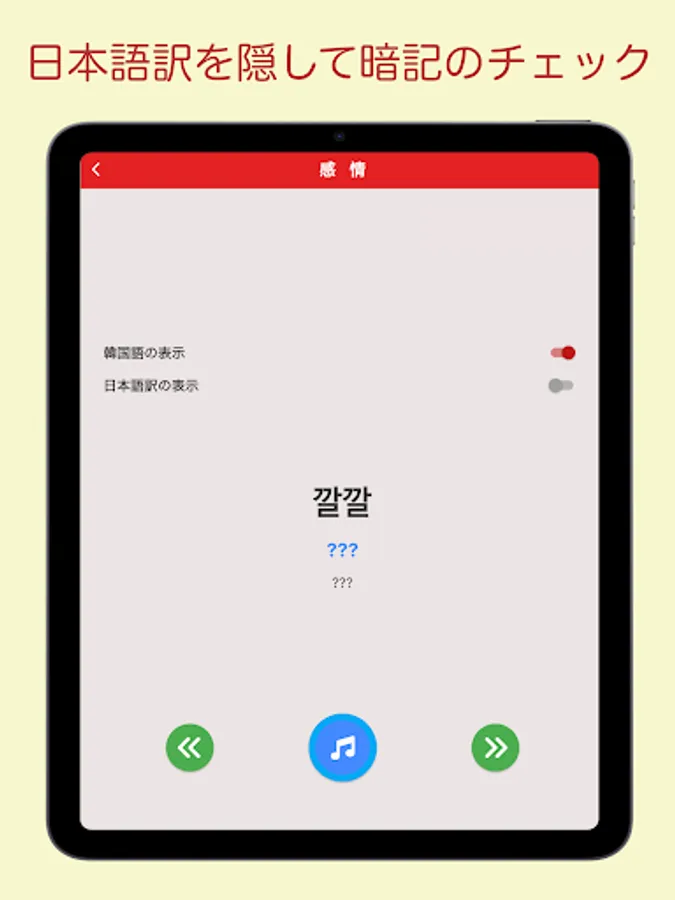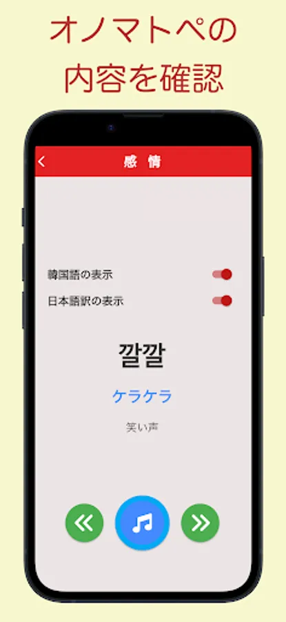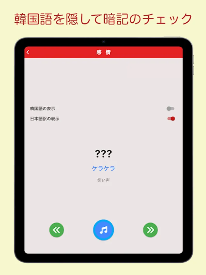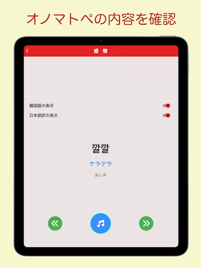 →You can check the memorization status of Korean onomatopoeia words by pronunciation and Japanese translation.