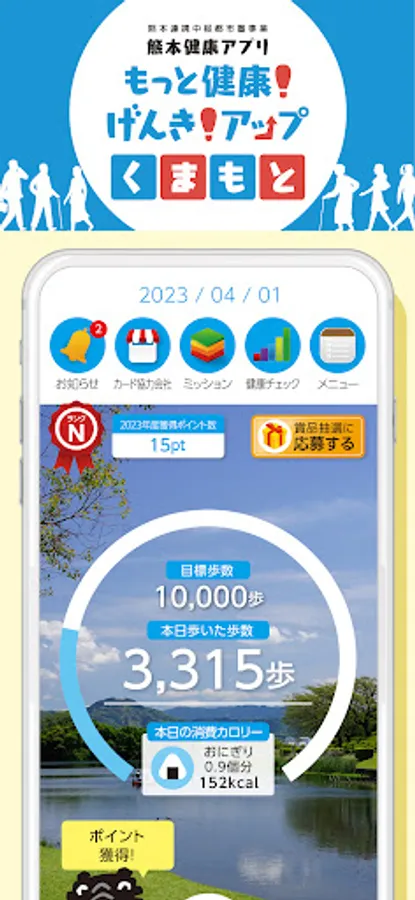 The Kumamoto Health App "Motto Health! Genki! Up Kumamoto" is an app that gives you points by performing daily health promotion activities such as "walking", and when you accumulate points, you can receive benefits at cooperating stores.