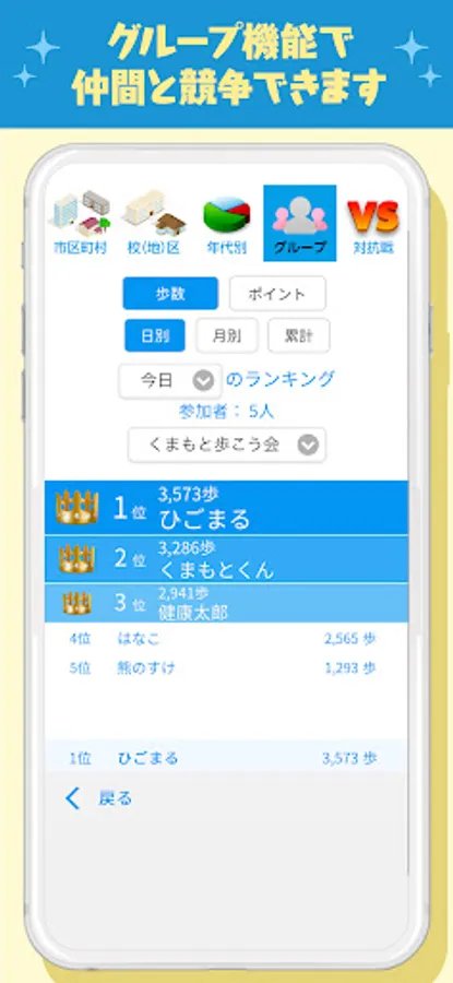 You can create groups with friends, family members, companies / departments, and compete within your peers or between groups.