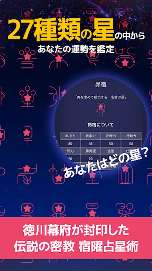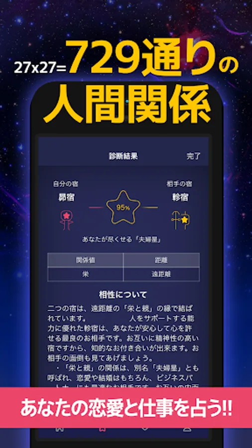生年月日から、27の『宿』と呼ばれる個性を導き出し、自分と相手の『宿』を知ることで、互いの相性や距離、力関係を計ることができます。