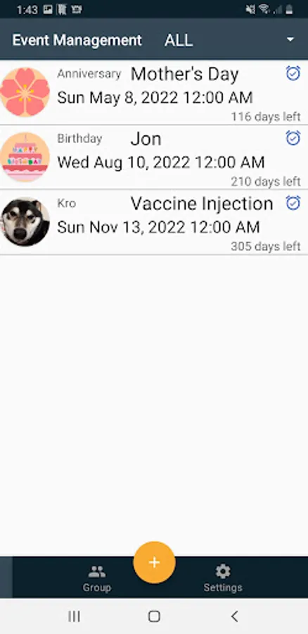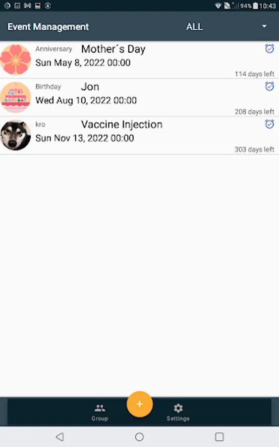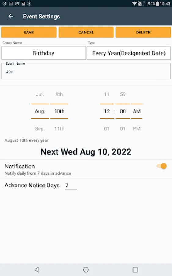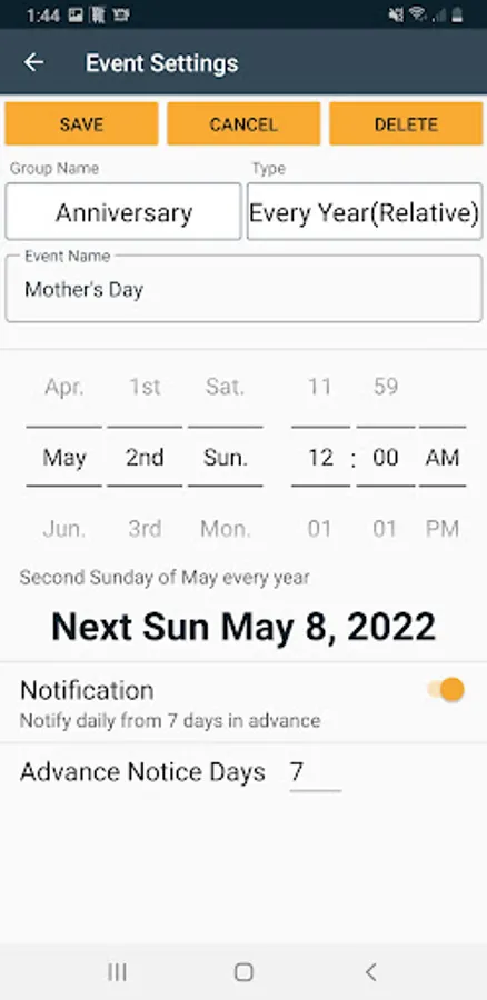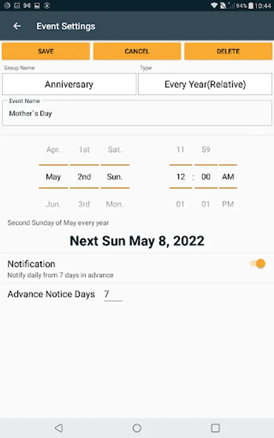 Birthdays and anniversaries are set by default, but you can add them as you like.