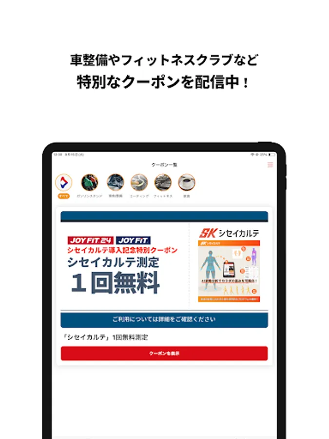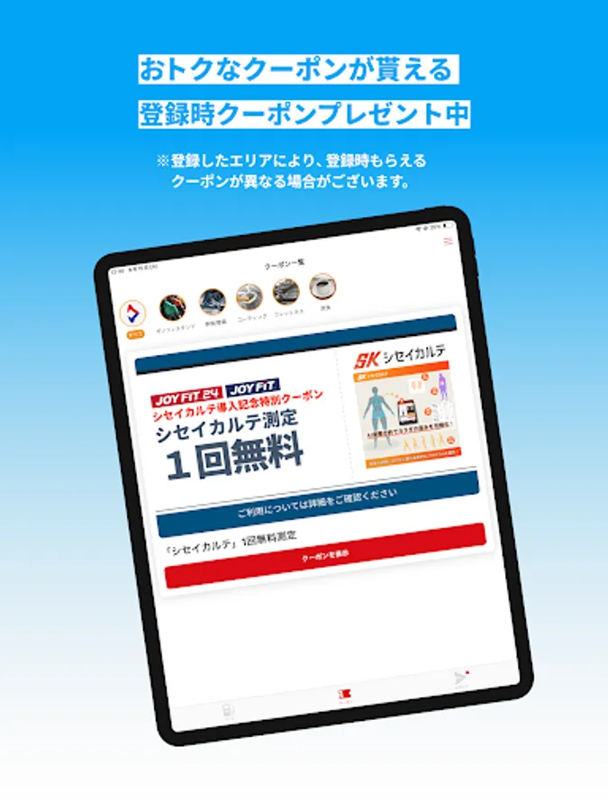 You can receive app member-only coupons that can be used at Aizu General Group gas stations, car repair shops, fitness clubs, and restaurants!