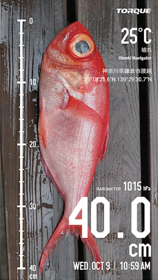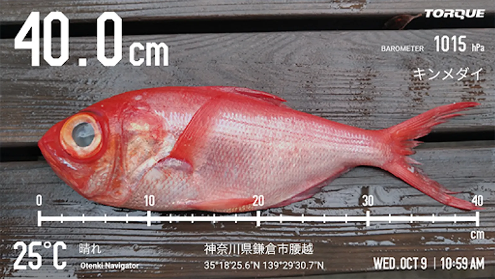 You can measure the length of the fish and shoot while displaying the fish name, date and time, temperature, weather, location information, and barometric pressure on the preview screen.