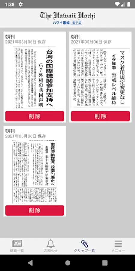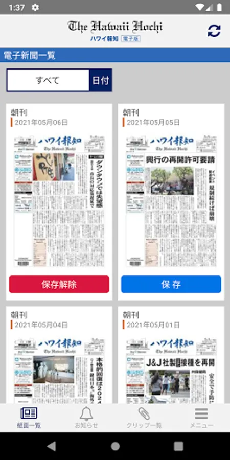 ・ If you select "Save" from the electronic newspaper list screen, you can download the paper image by date. You can browse even in an environment where the network is not connected.