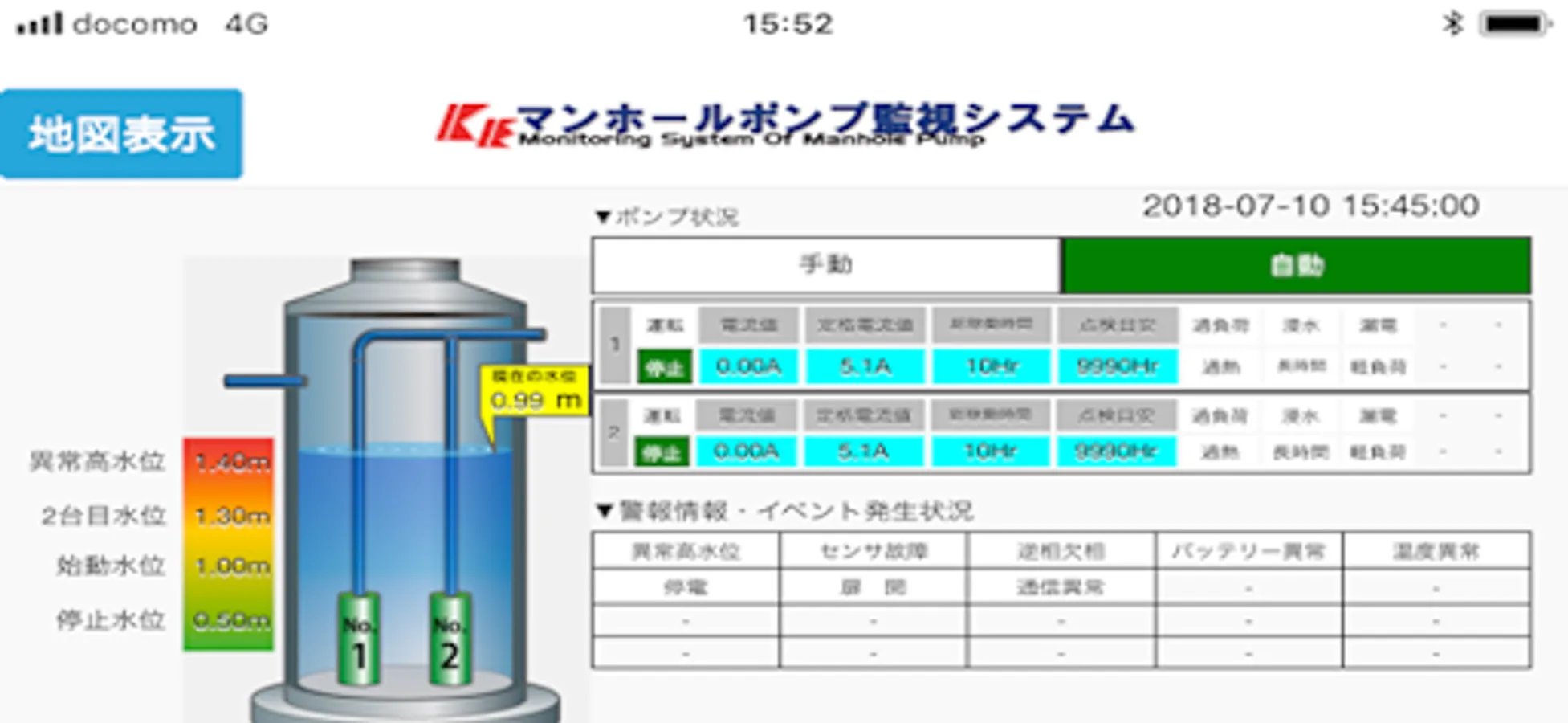 Display facility overview, control panel, water level gauge, and pump specifications.