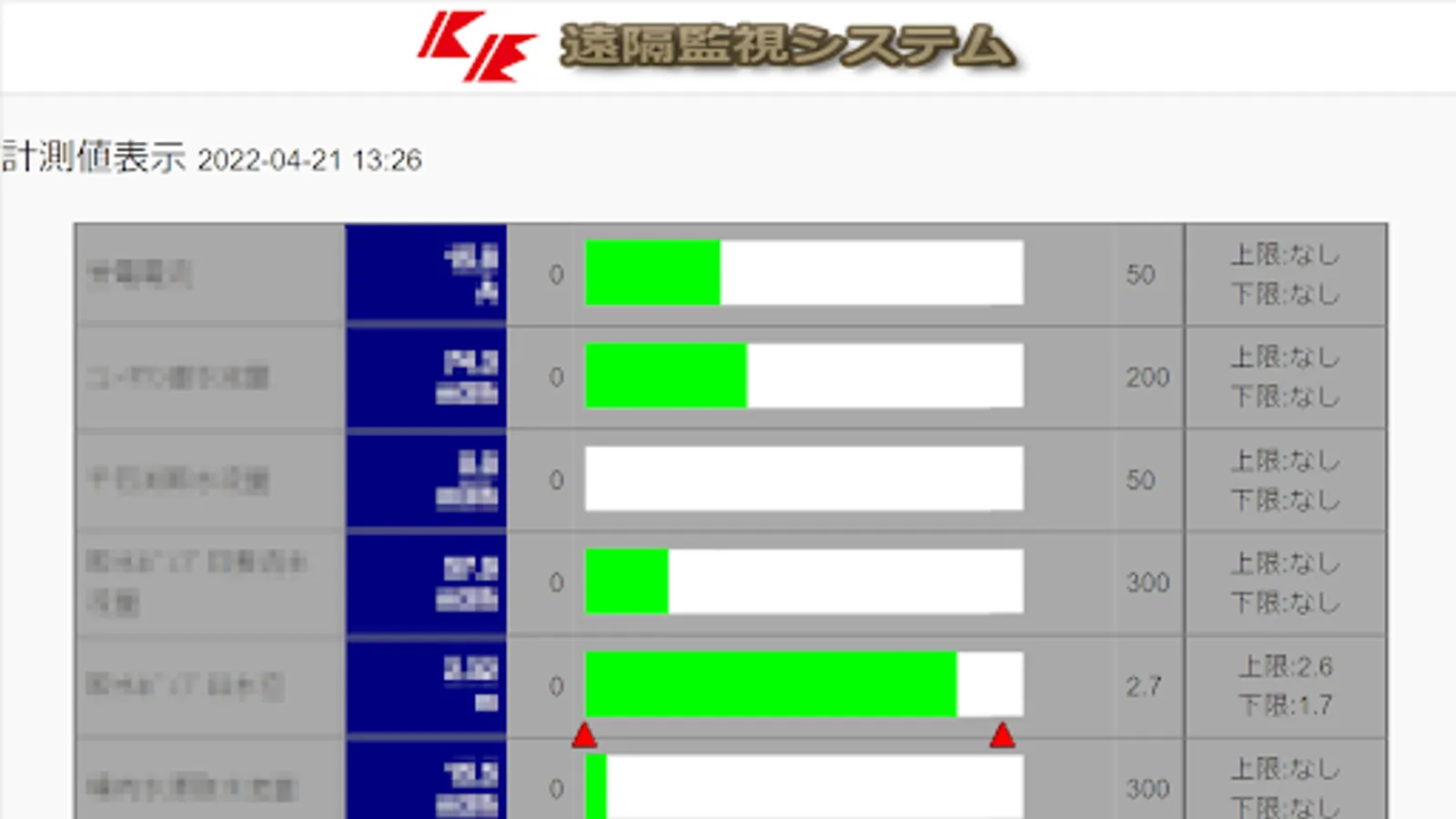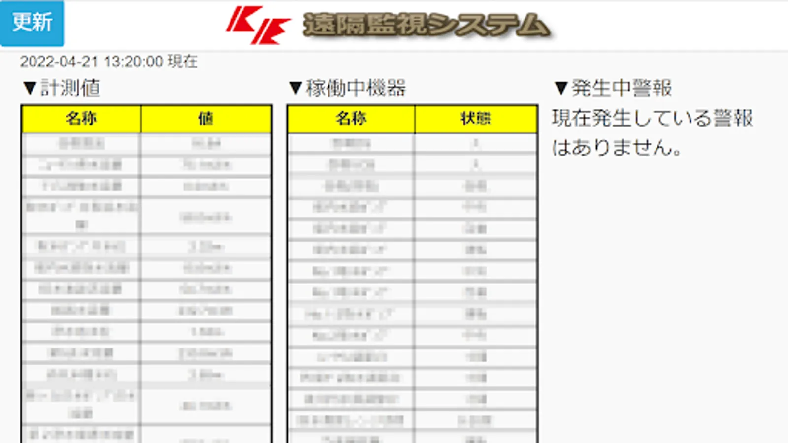 Displays the status of the equipment to be monitored. Data is collected at a specified time by the facility, but it is possible to acquire the data at that time from the site and display it by updating manually.