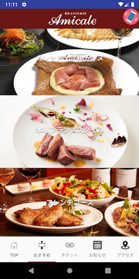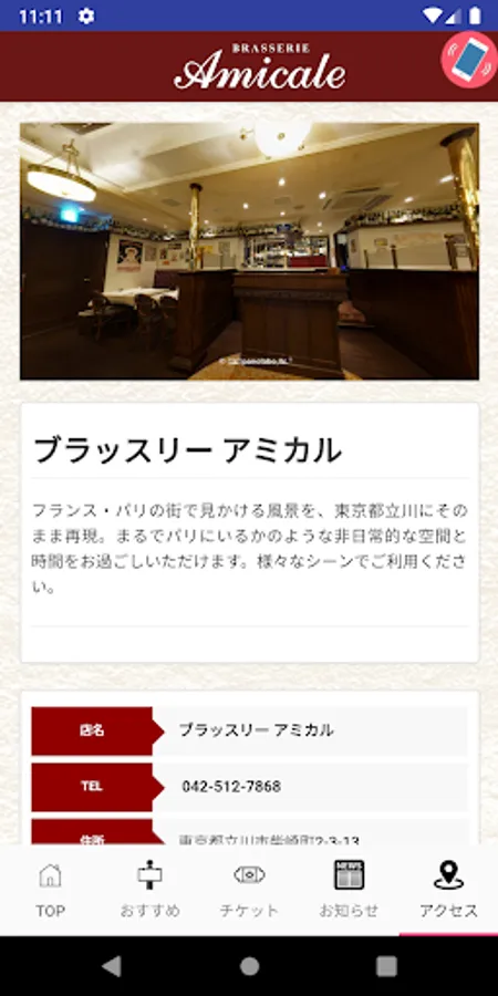 Amicale app is the official app of the French restaurant "Amicale" in Shibasaki-cho, Tachikawa-shi, Tokyo.