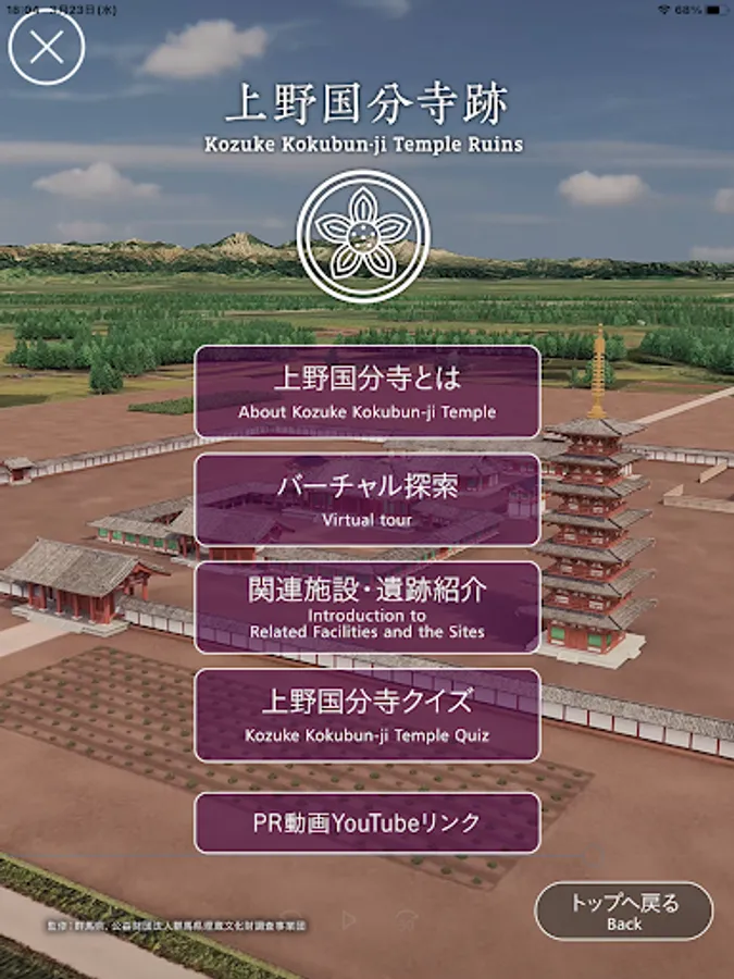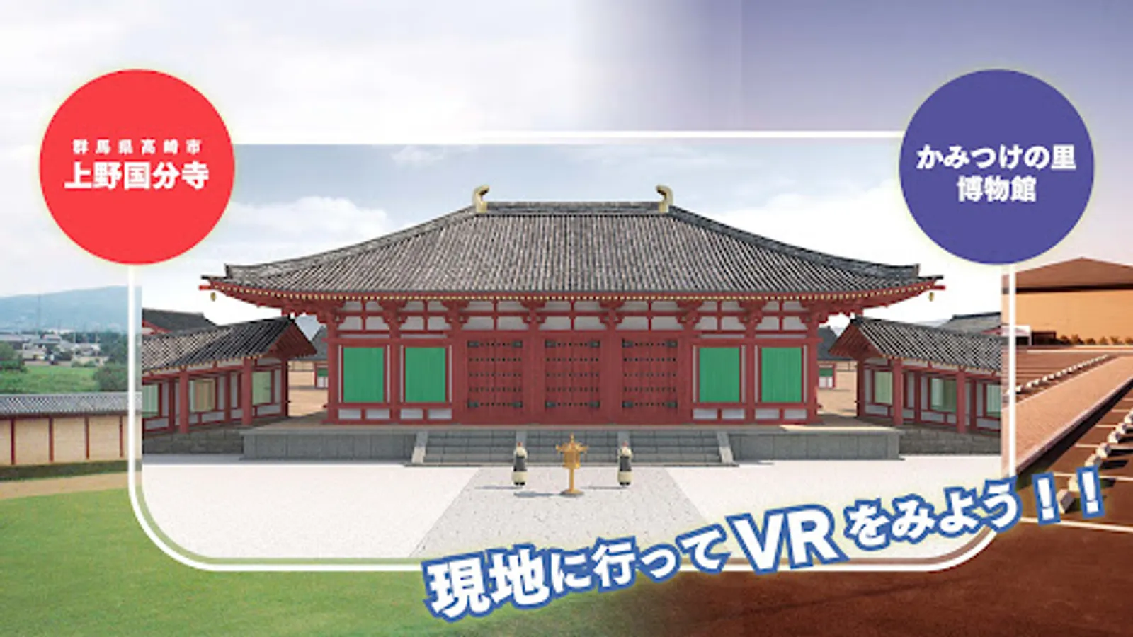Enter the four viewpoint areas set in Ueno Kokubunji and one view point area set in Kamitsukenosato Museum, and press the icon to display the old Ueno Kokubunji building and VR that reproduces the ancient rice fields. ..