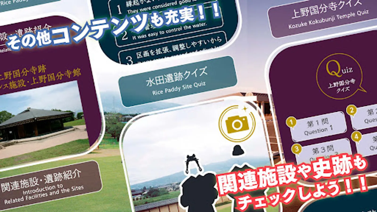 You can browse quizzes and explanations about Ueno Kokubunji and the paddy field ruins.