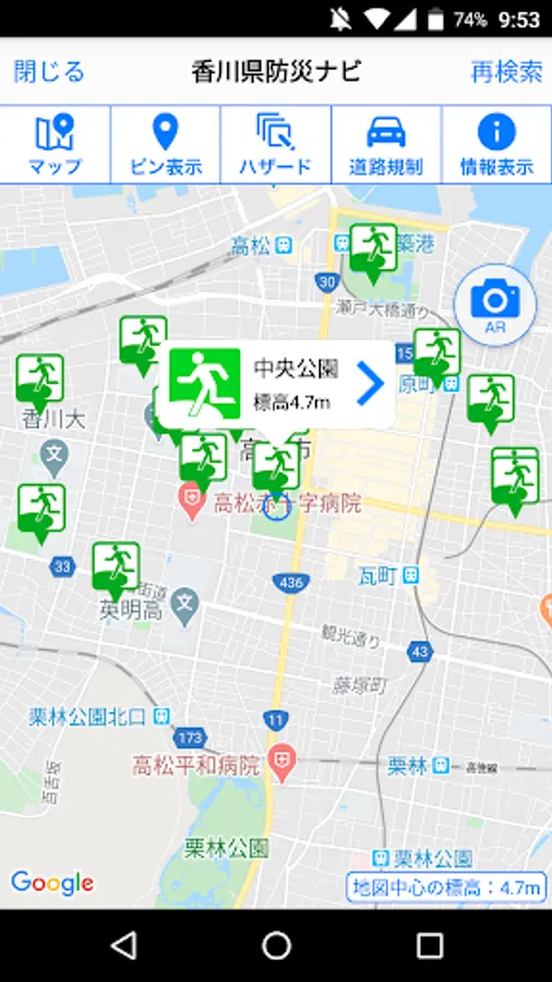 現在地周辺の指定避難所・指定緊急避難場所や詳細が表示され、ARカメラ機能や避難コンパス機能で災害時の避難行動を支援します。