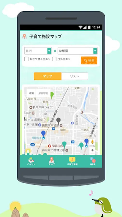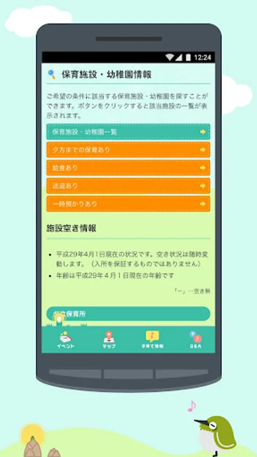 送迎あり・給食ありの施設や保育所・保育園・こども園などの空き状況を確認できます。