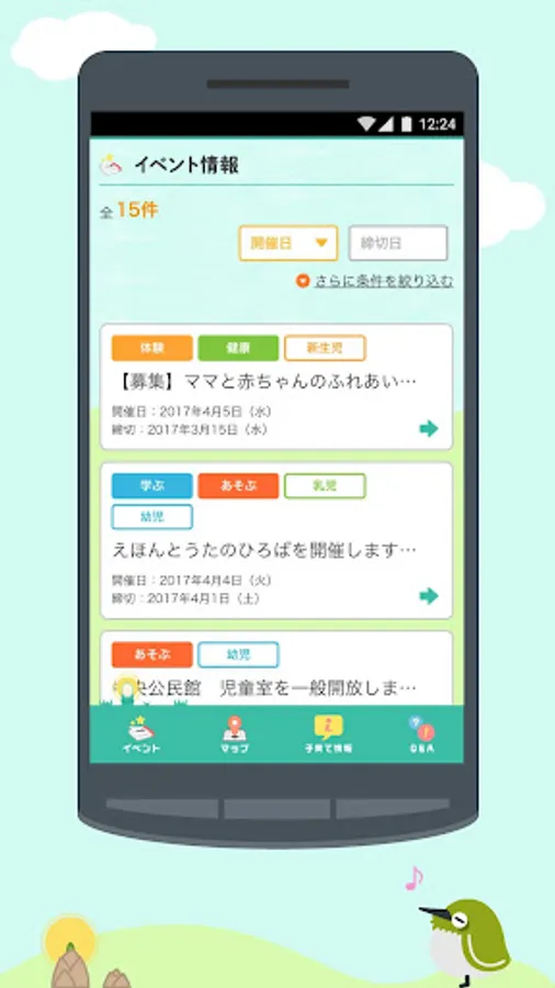 学ぶ、あそぶ等のカテゴリーや託児あり、無料のイベントを検索できます。